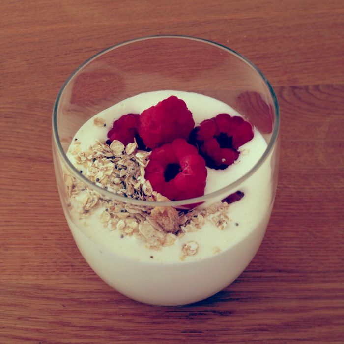 Porridge auf zwei Portionen verteilen und oben drauf verteilen. Mit Himbeeren dekorieren – fertig!